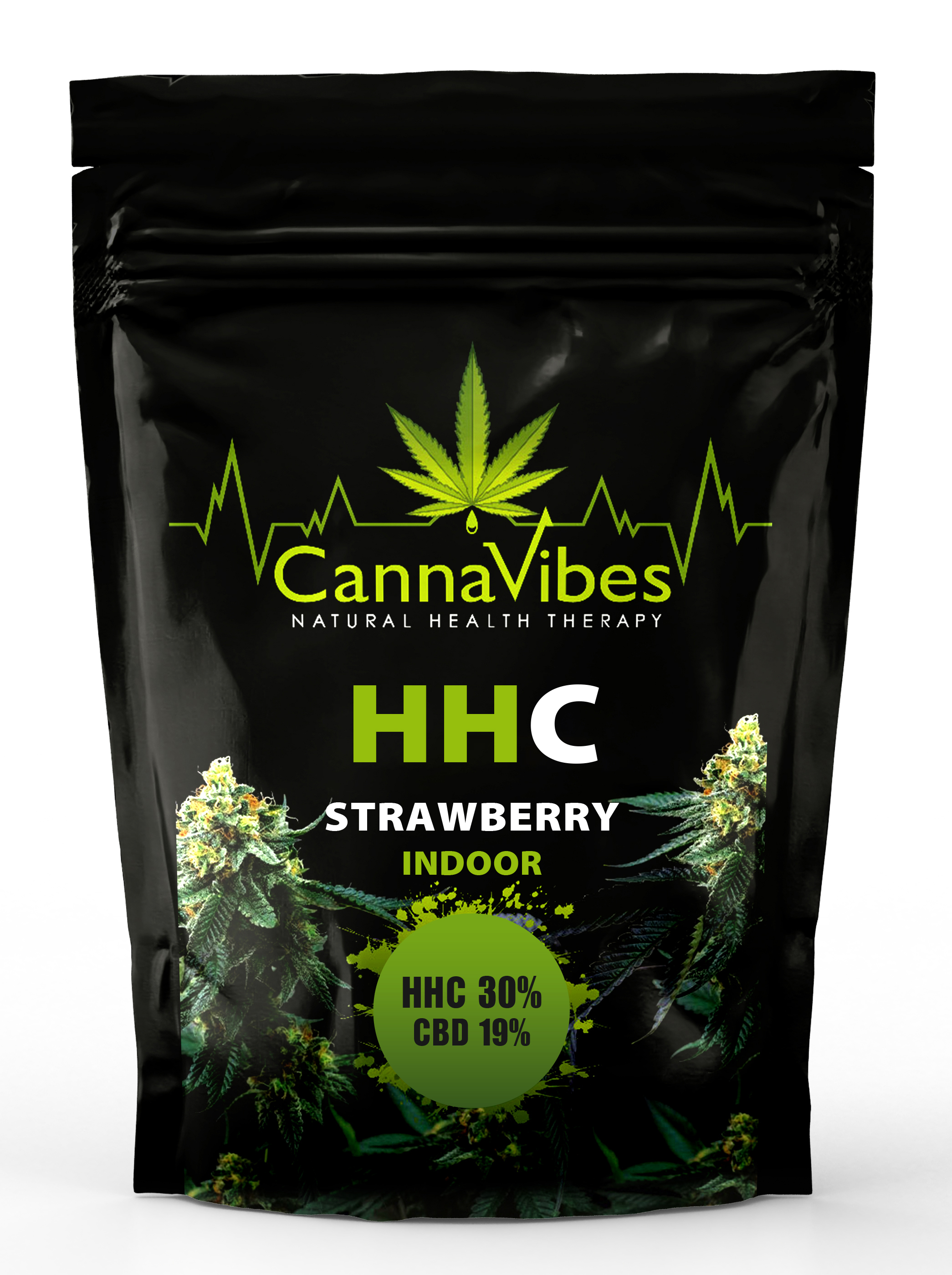 Επιλεγμένοι Ανθοί Κάνναβης ποικιλίας Strawberry, που προέρχονται από 100% οργανική καλλιέργεια εσωτερικού χώρου (Indoor) με περιεκτικότητα σε HHC 30%, CBD 19% και τιμή THC μικρότερη από 0,2%, όπως απαιτείται από την ευρωπαϊκή νομοθεσία.